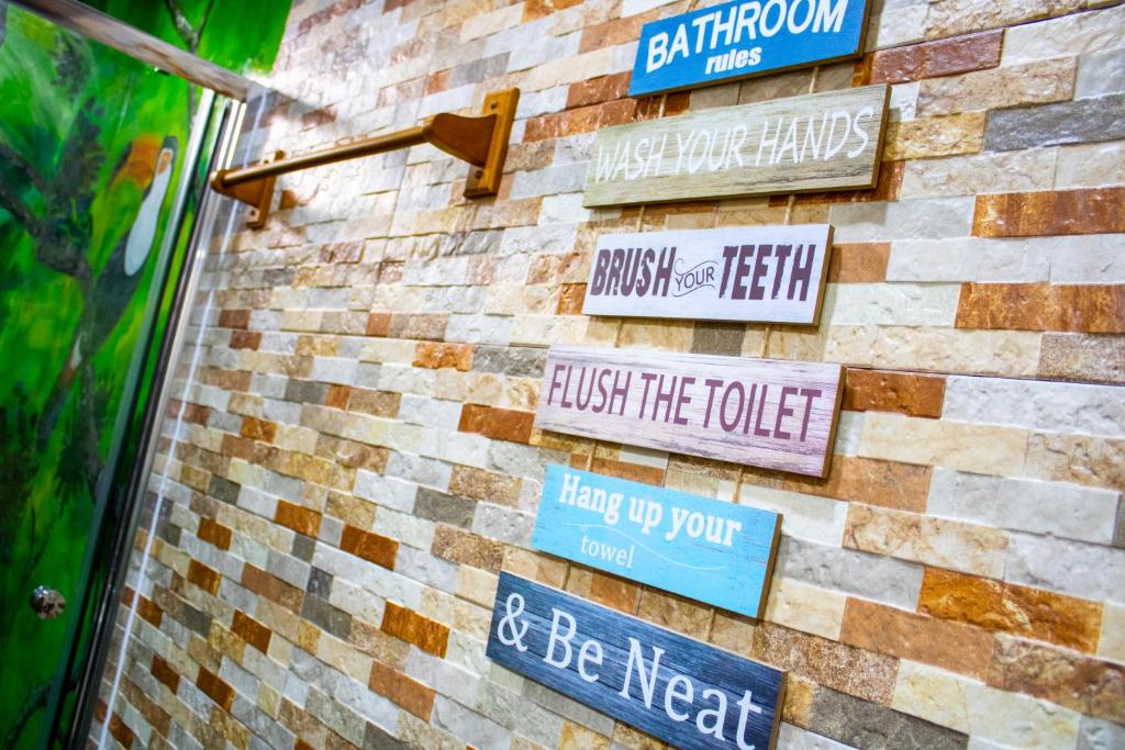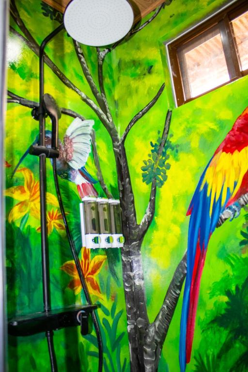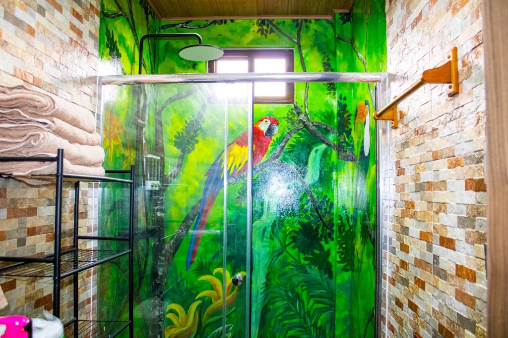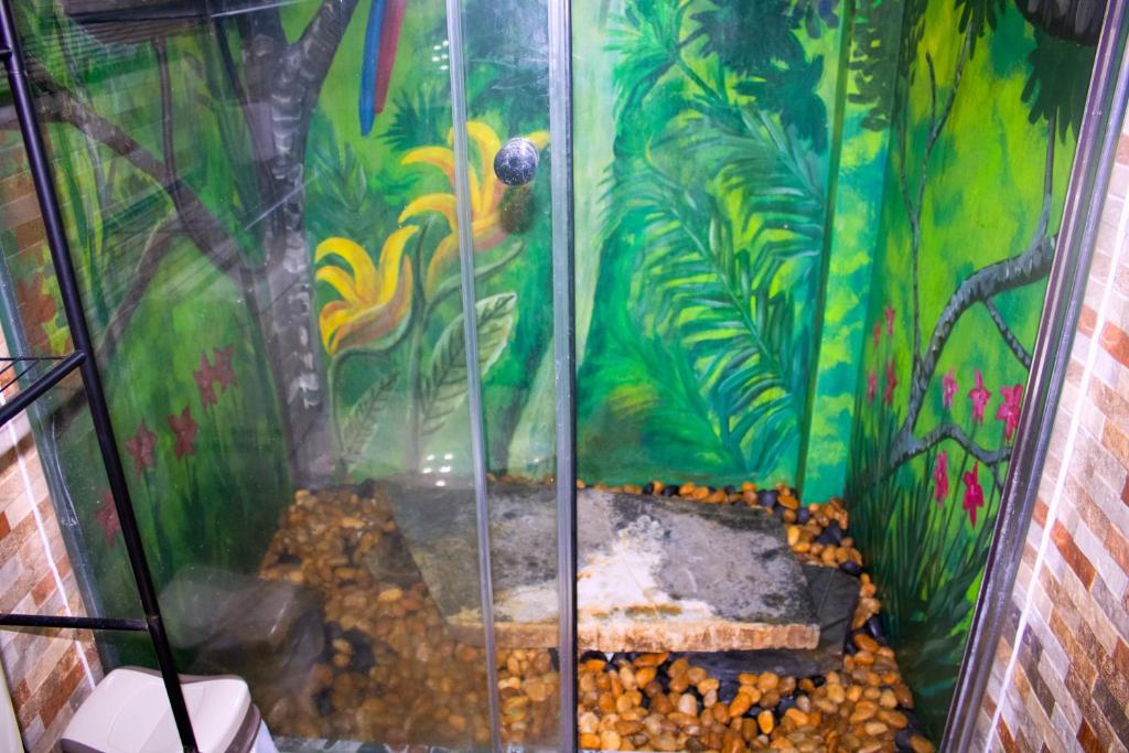 Contamos con un hermoso baño estilo montaña. Con decoraciones increíbles que te harán creer que estas en el bosque, mientras disfrutas del agua proveniente de manantiales en las altas colinas de La Laguna de San Carlos.